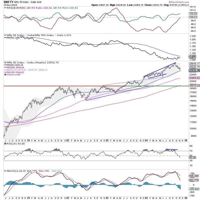The coming week is truncated as well. Wednesday, November 20th is a trading holiday due to Assembly Elections in the state of Maharashtra. The markets are undergoing a painful mean-reversion process. As of now, though the Nifty has closed a notch below the 200-DMA, which is currently placed at 23555, it has managed to defend this important support. Beyond this, the Nifty is within striking distance of the 50-week MA, which presently stands at 23253. Even if the index ends up testing this level, the long-term primary uptrend would still stay intact. Two possibilities remain distinct. A relief rally in the form of a technical pullback cannot be ruled out, but, in the same breath, the markets remain weak and vulnerable to extended corrective pressure.